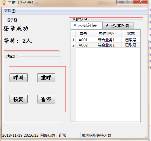功能区:主要有呼叫、重呼、恢复、暂停四个按钮。呼叫是呼叫下一个客户,重呼是重新呼叫当前客户,暂停是暂停取号,恢复是恢复取号。